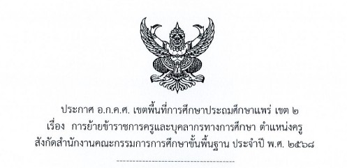 ประกาศ อ.ก.ค.ศ. เขตพื้นที่การศึกษาประถมศึกษาแพร่ เขต 2 เรื่อง การย้ายข้าราชการครูและบุคลากรทางการศึกษา ตำแหน่งครูสังกัดสำนักงานคณะกรรมการการศึกษาขั้นพื้นฐาน ประจำปี พ.ศ. 2568 (การย้ายกรณีพิเศษ)