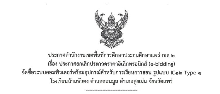 ประกาศจัดซื้อจัดจ้าง ยกเลิกประกวดราคาอิเล็กทรอนิกส์ e-bidding ซื้อระบบคอม รร บ้านหัวดง 22 มีนาคม 2026 admin ประกาศ สพป.แพร่ เขต 2 เรื่องประกาศยกเลิกประดาวน์โหลด