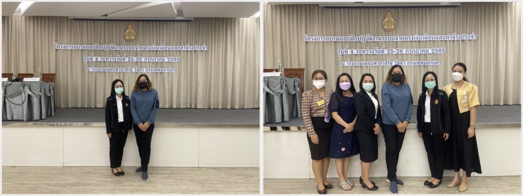 นางสาวกมลพร แสนสุวรรณ์ ผอ.กลุ่มบริหารงานการเงินและสินทรัพย์ และนางสุวิชญา นาเหมือง นักทรัพยากรบุคคลปฏิบัติการ เข้าร่วมโครงการอบรมและฝึกปฏิบัติงานระบบจ่ายตรงเงินเดือนและค่าจ้างประจำ รุ่นที่ 4 ระหว่างวันที่ 25-26 กรกฎาคม 2565 ณ โรงแรมเดอะพาลาสโซ รัชดา กรุงเทพมหานคร