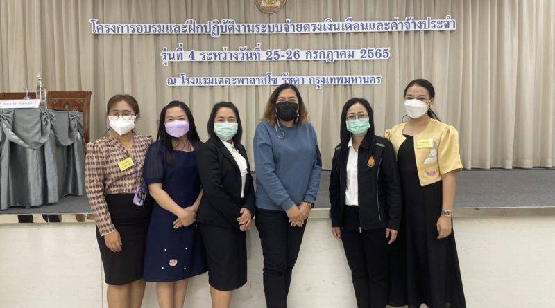 นางสาวกมลพร แสนสุวรรณ์ ผอ.กลุ่มบริหารงานการเงินและสินทรัพย์ และนางสุวิชญา นาเหมือง นักทรัพยากรบุคคลปฏิบัติการ เข้าร่วมโครงการอบรมและฝึกปฏิบัติงานระบบจ่ายตรงเงินเดือนและค่าจ้างประจำ รุ่นที่ 4 ระหว่างวันที่ 25-26 กรกฎาคม 2565 ณ โรงแรมเดอะพาลาสโซ รัชดา กรุงเทพมหานคร